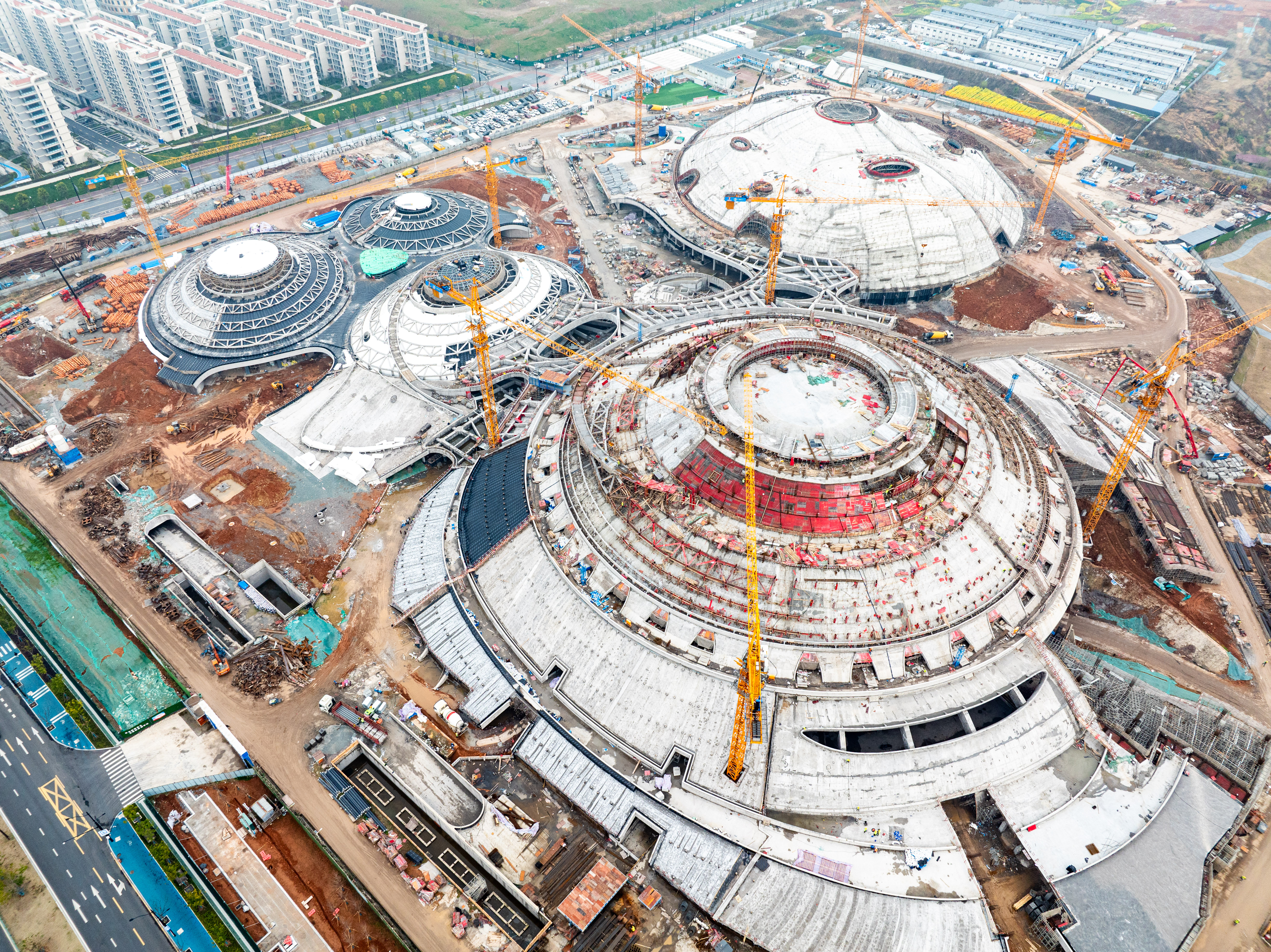 由中國十七冶承建的蘭州奧體中心,采用“飛天花舞”設(shè)計(jì)理念,建筑猶如五朵花舞動(dòng)于絲綢之路上,總建筑面積46.6萬平方米,由60000座玫瑰體育場、8000座郁金香綜合館、3000座百合游泳館、3000座荷花網(wǎng)球館、蘭花運(yùn)動(dòng)員公寓等單體組成。其中郁金香綜合館弦支穹頂是世界上首個(gè)吊掛大噸位斗形屏(40t)的矢跨比小于1/12的90米級(jí)大跨度弦支穹頂結(jié)構(gòu)工程。